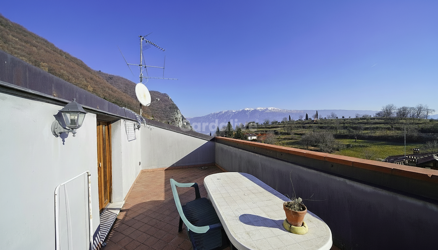 L’ingresso conduce a un luminoso soggiorno con camino a legna, arricchito dall’accesso diretto a una balconata panoramica che regala una vista aperta sul Lago di Garda e sulle montagne circostanti. Sullo stesso piano si trovano un bagno finestrato, due camere matrimoniali, entrambe con accesso alla balconata, e un comodo ripostiglio. Completa il livello una stanza soppalcata, attualmente utilizzata come terza camera da letto, ideale anche come studio o zona relax.