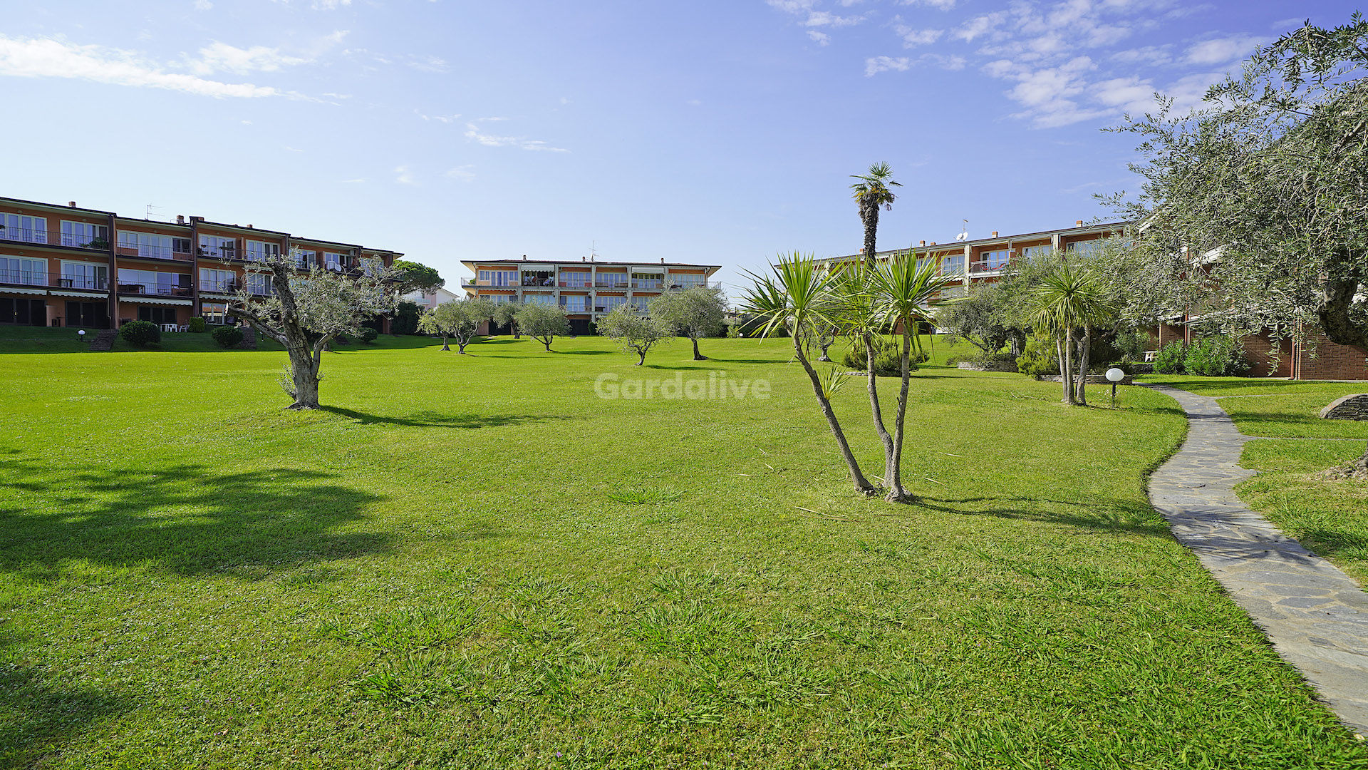 La zona giorno è ampia e molto luminosa, con cucina a vista e grande vetrata che conduce al portico privato, uno spazio esterno riservato perfetto per momenti di relax, colazioni all’aperto o cene al tramonto. Dal soggiorno si accede direttamente al grande parco condominiale, finemente curato, che ospita la piscina fronte lago e aree verdi di assoluto pregio.