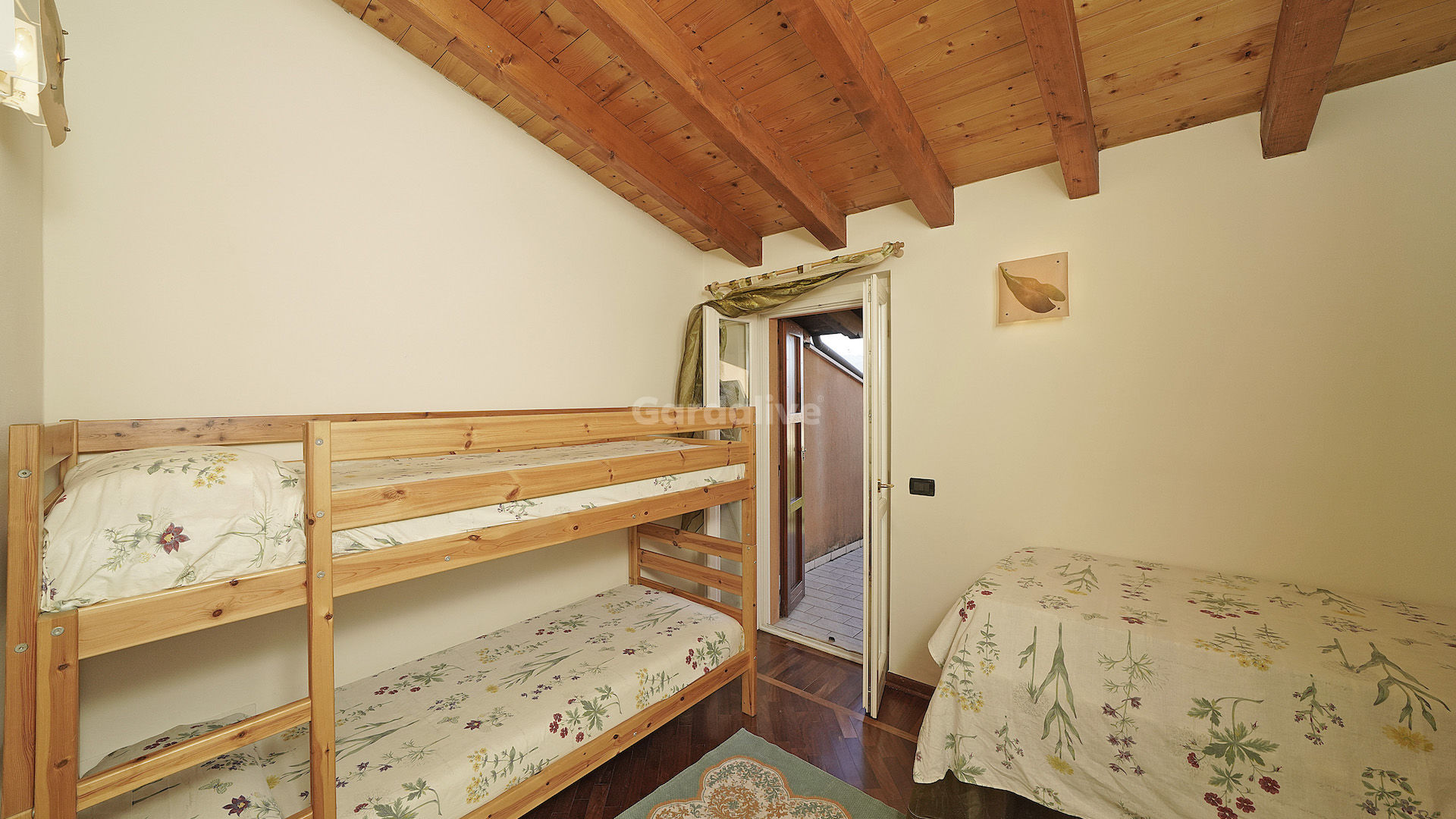 Al piano superiore si trovano due camere da letto e un secondo bagno; entrambe le stanze dispongono di sfoghi esterni, una con balcone e l’altra con terrazzo panoramico che offre una splendida vista sul Lago di Garda.