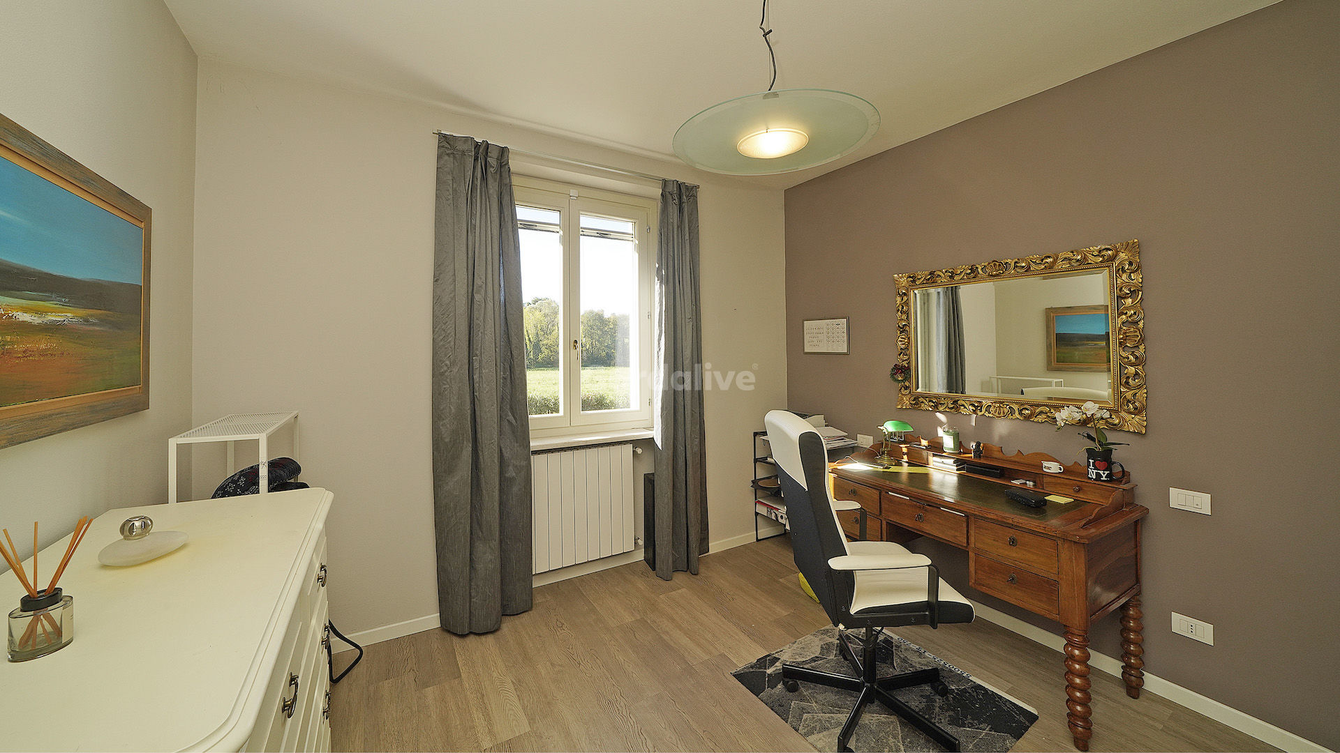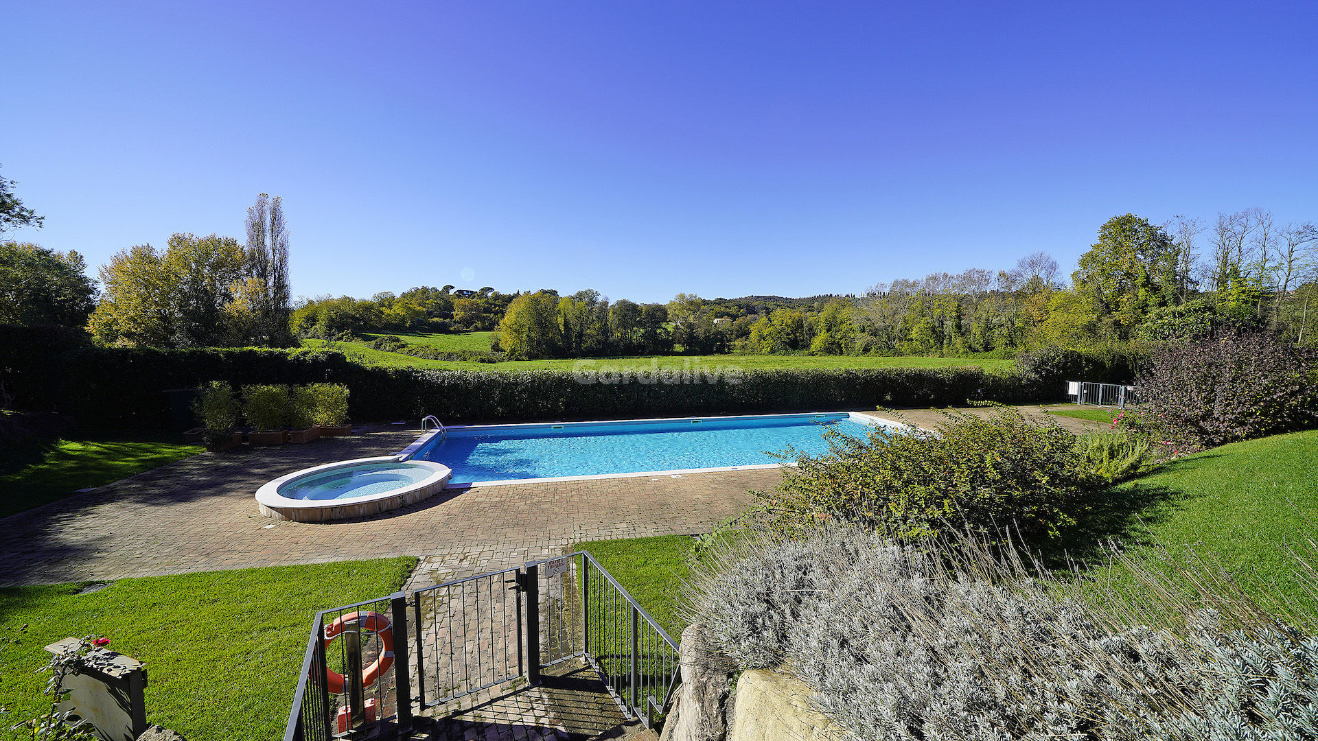 L’ingresso si apre su un ampio soggiorno con cucina a vista e due porte finestre che conducono al portico privato con splendida vista sulla piscina, perfetto per pranzi all’aperto o momenti di relax. Un disimpegno separa la zona giorno dalla zona notte, dove si trova un'ampia camera matrimoniale con bagno privato ed una seconda camera adibita a studio, conclude la zona il bagno finestrato con doccia.