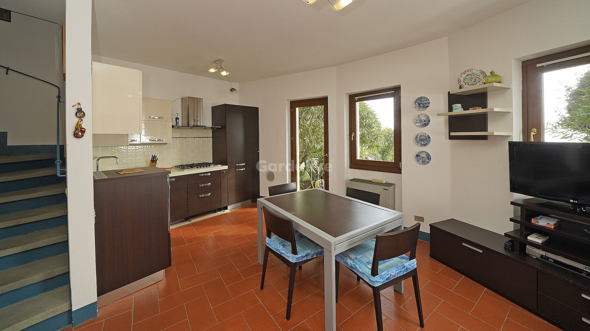 Al piano terra troviamo un luminoso soggiorno con angolo cottura, con accesso diretto al porticato e al giardino condominiale ad uso esclusivo, oltre a un bagno di servizio.