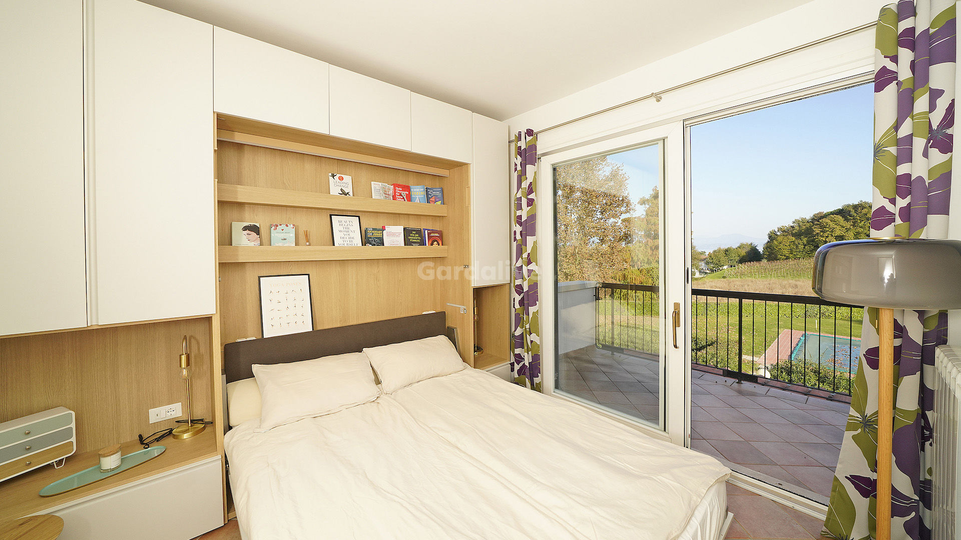 Al piano terra si sviluppa la zona giorno con un ampio soggiorno affacciato sul portico vista piscina, cucina separata e bagno di servizio. Al piano superiore si trovano una camera doppia, un bagno finestrato con doccia e una camera matrimoniale con accesso diretto al balcone, da cui si gode uno scorcio di vista lago e della piscina. L’abitazione è circondata su tre lati da un grande giardino privato, arricchito da due portici coperti e un’area barbecue perfetta per serate estive e grigliate strategiche.