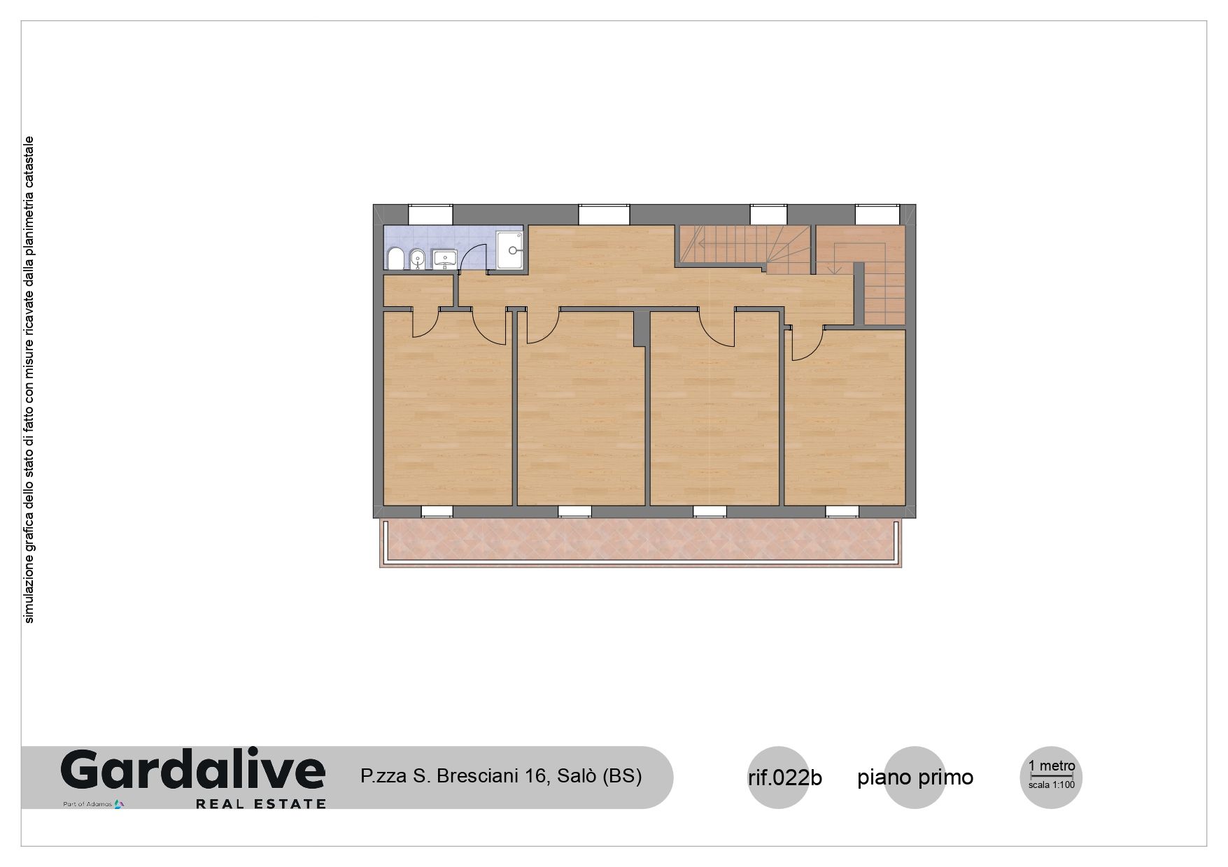 I piani superiori godono ciascuno di un balcone esclusivo; la terrazza all'ultimo piano offre una piacevole vista sulla città di Salò. L'immobile gode di una seconda e comoda entrata al primo piano, con ingresso dalla parte posteriore del fabbricato.