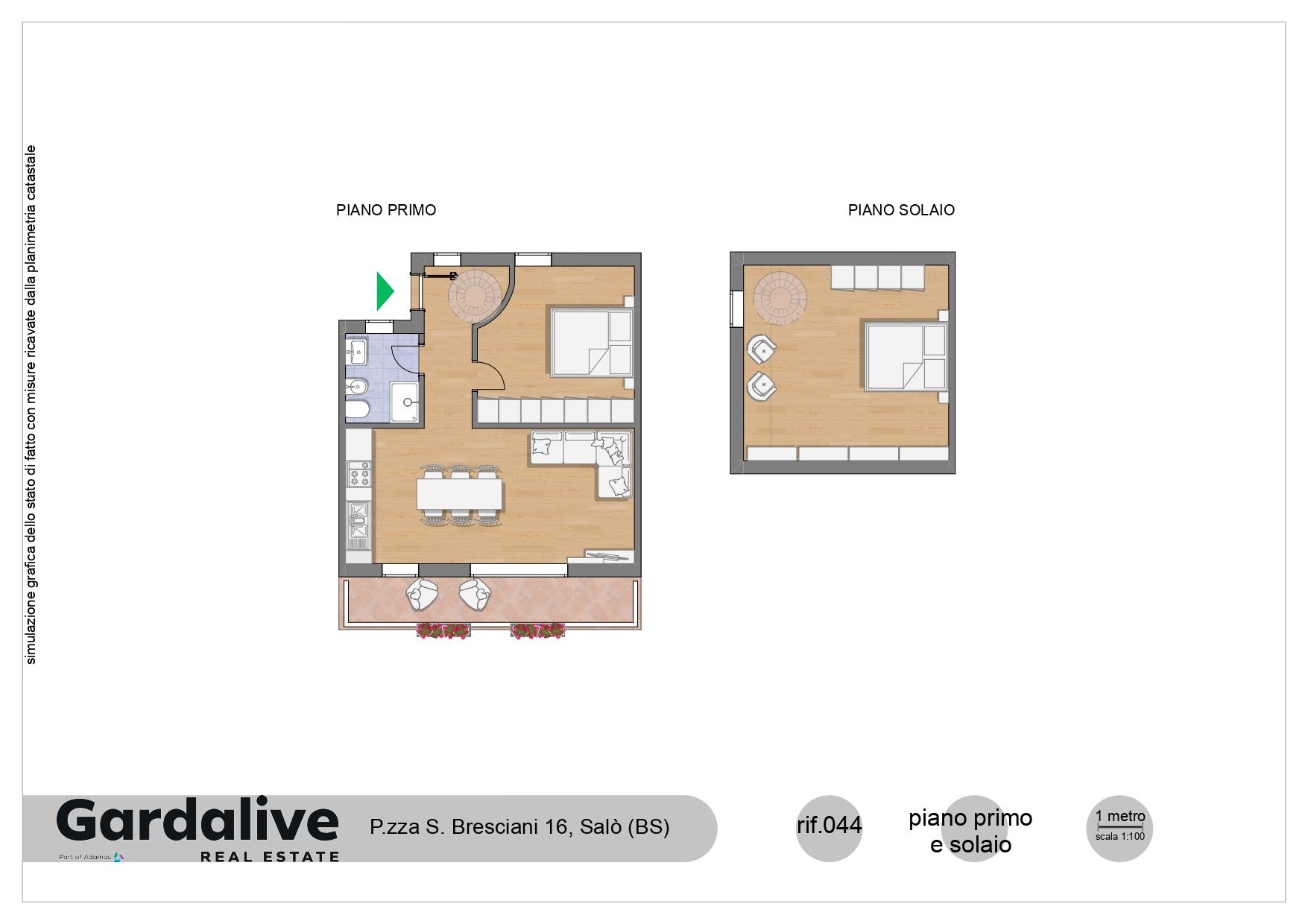 L’immobile si trova al primo piano e si compone dall’ingresso che porta alla zona giorno; qui troviamo la parete cottura attrezzata, il tavolo da pranzo ed un comodo divano letto. Tramite una generosa porta finestra che dona luce e respiro a quest’area, si accede alla terrazza esclusiva, rivolta a sud/est.