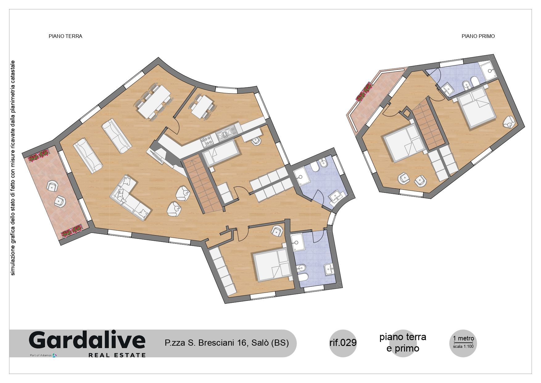 Salendo la scala interna, si accede al primo ed ultimo piano, composto da due ulteriori camere da letto matrimoniali, di cui una con esclusivo balcone, ed un servizio.