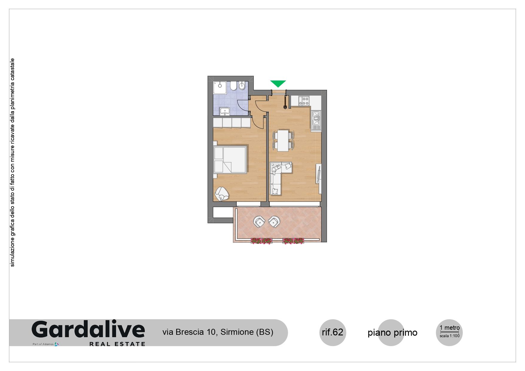 L’abitazione, di circa 45 mq, si compone di una luminosa zona giorno con angolo cottura e accesso diretto a un’ampia terrazza vivibile, ideale per pranzi all’aperto e momenti di relax con vista sul lago. La camera matrimoniale, spaziosa e confortevole, dispone anch’essa di uscita sulla terrazza, mentre il bagno finestrato è completo di doccia.